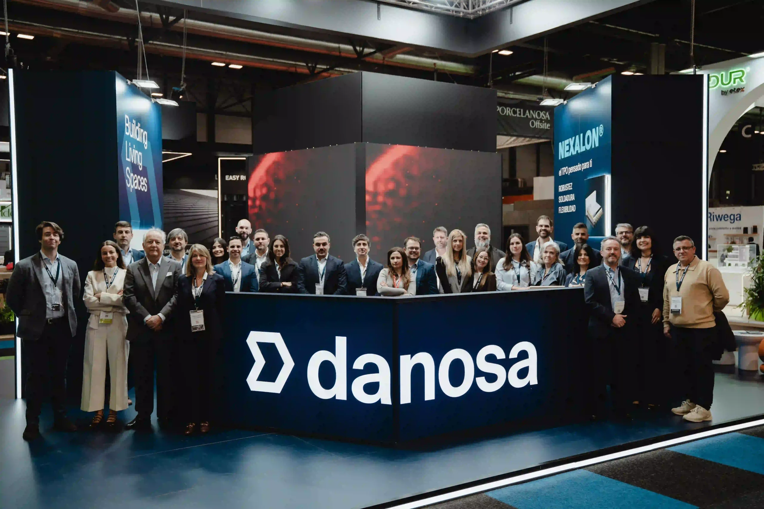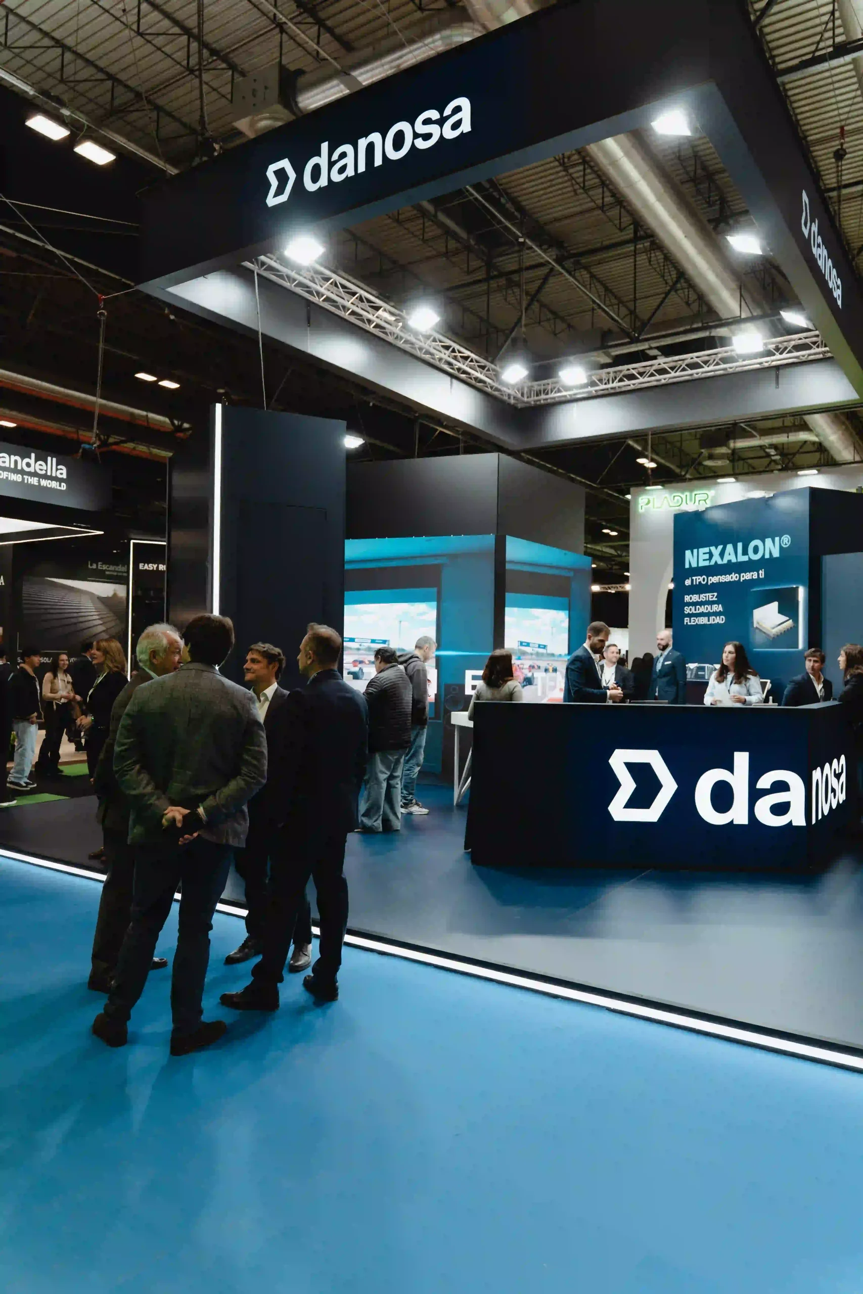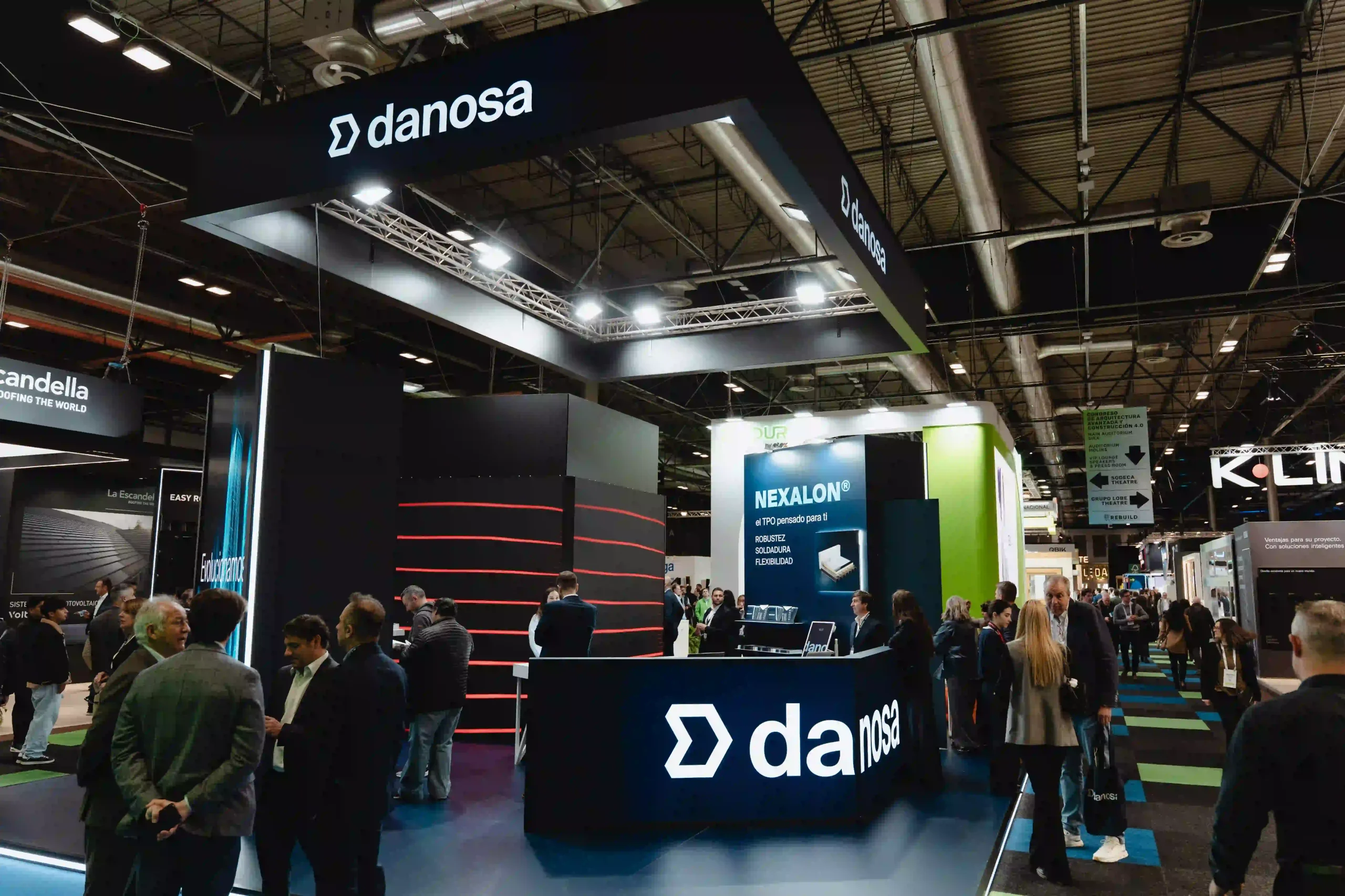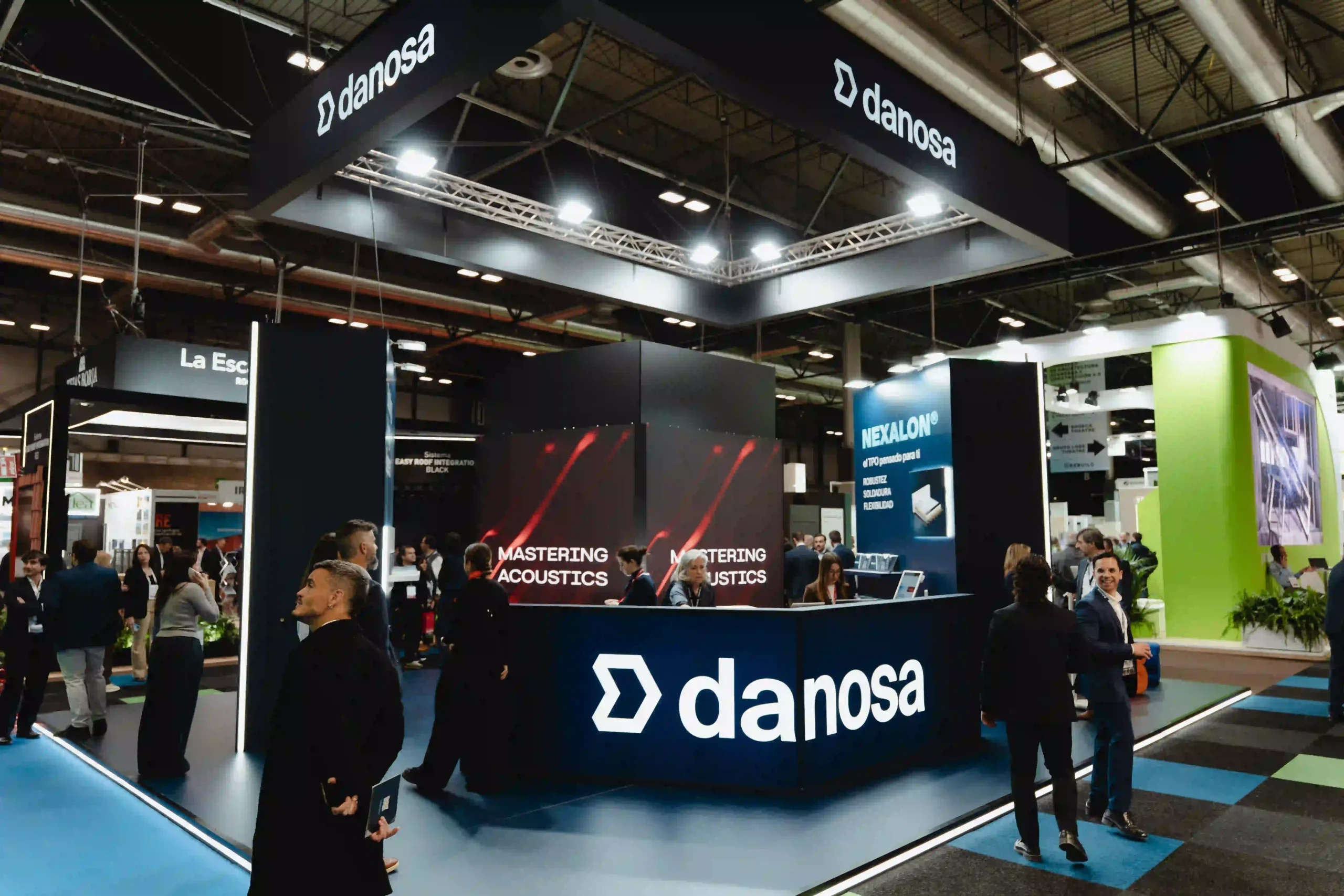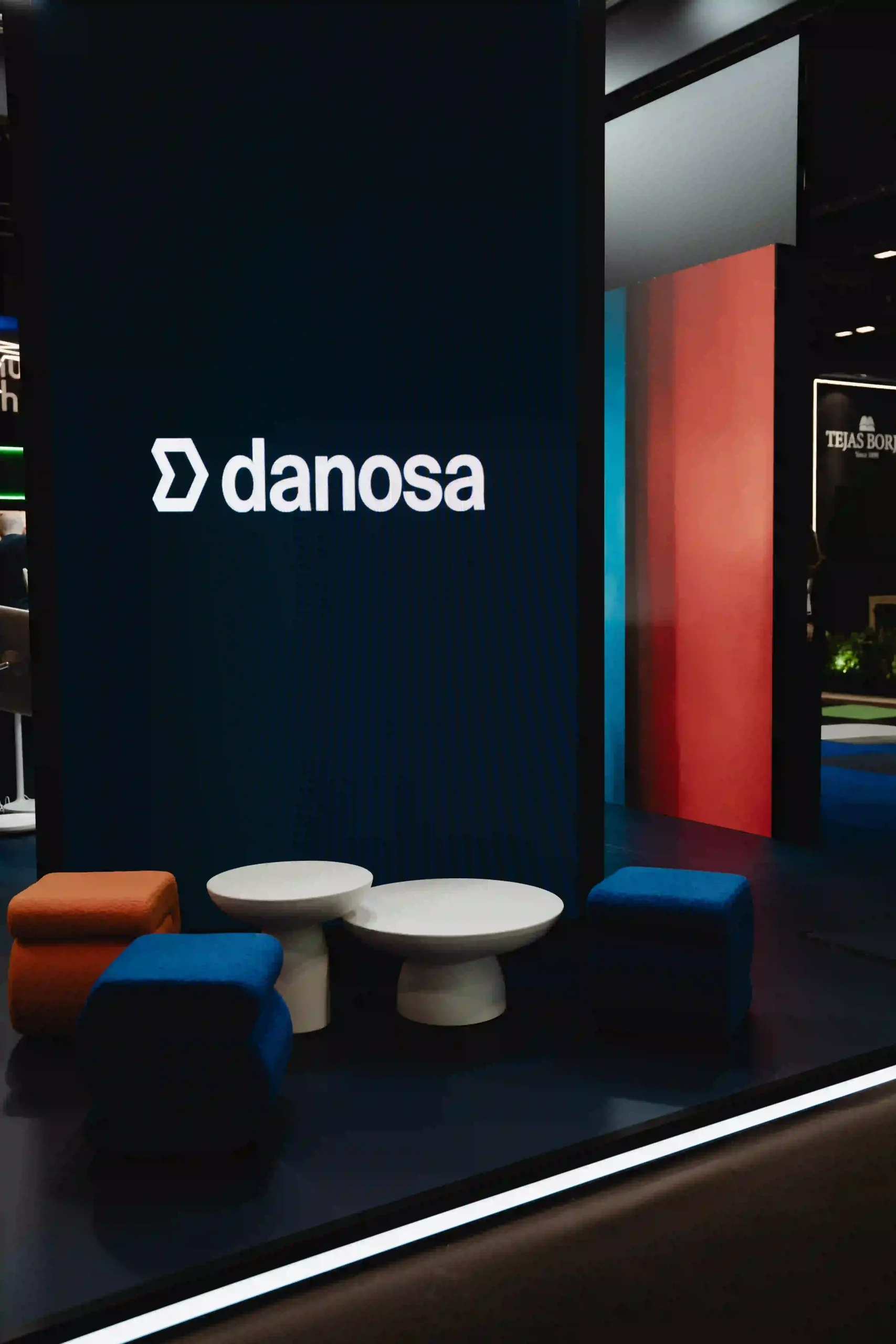 El diseño del stand ferial es una extensión de la identidad de Danosa: solidez e innovación en un mismo espacio. La estructura del stand es abierta, con un truss colgante que luce el logotipo de Danosa iluminado en grande, asegurando que se vea desde cualquier ángulo. La combinación de colores de tonos oscuros con la iluminación crea una atmósfera profesional pero acogedora.