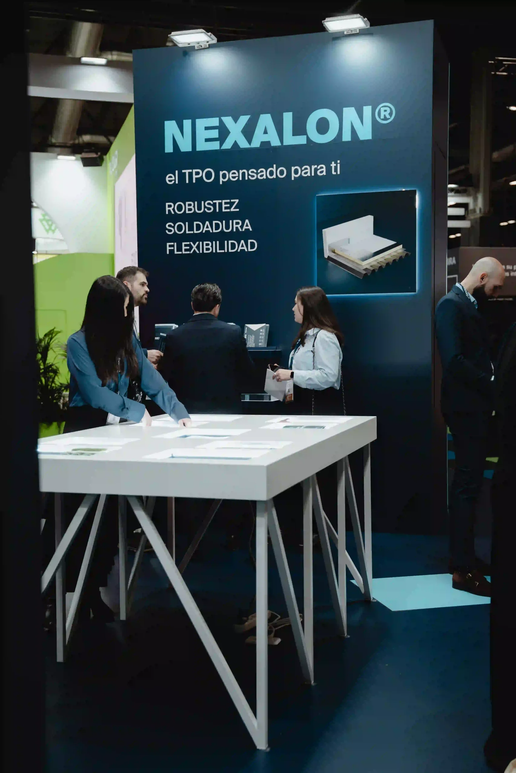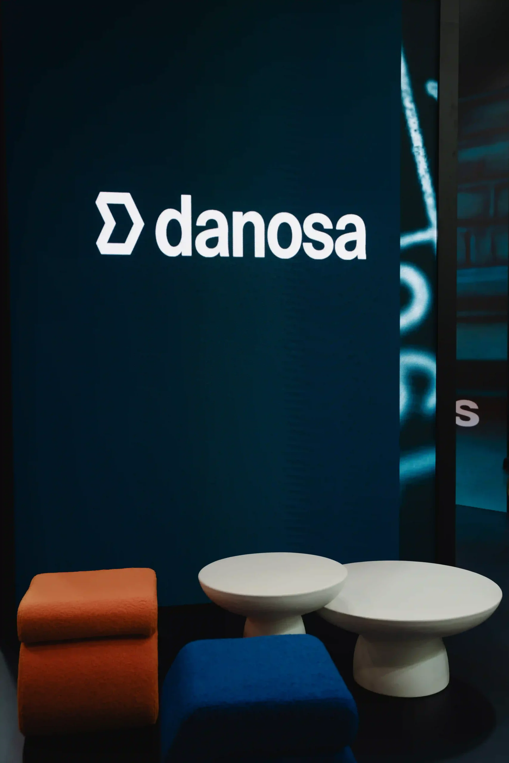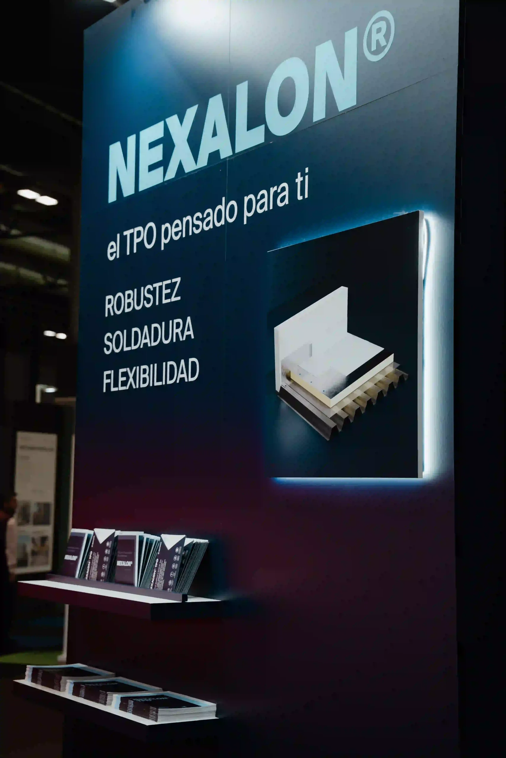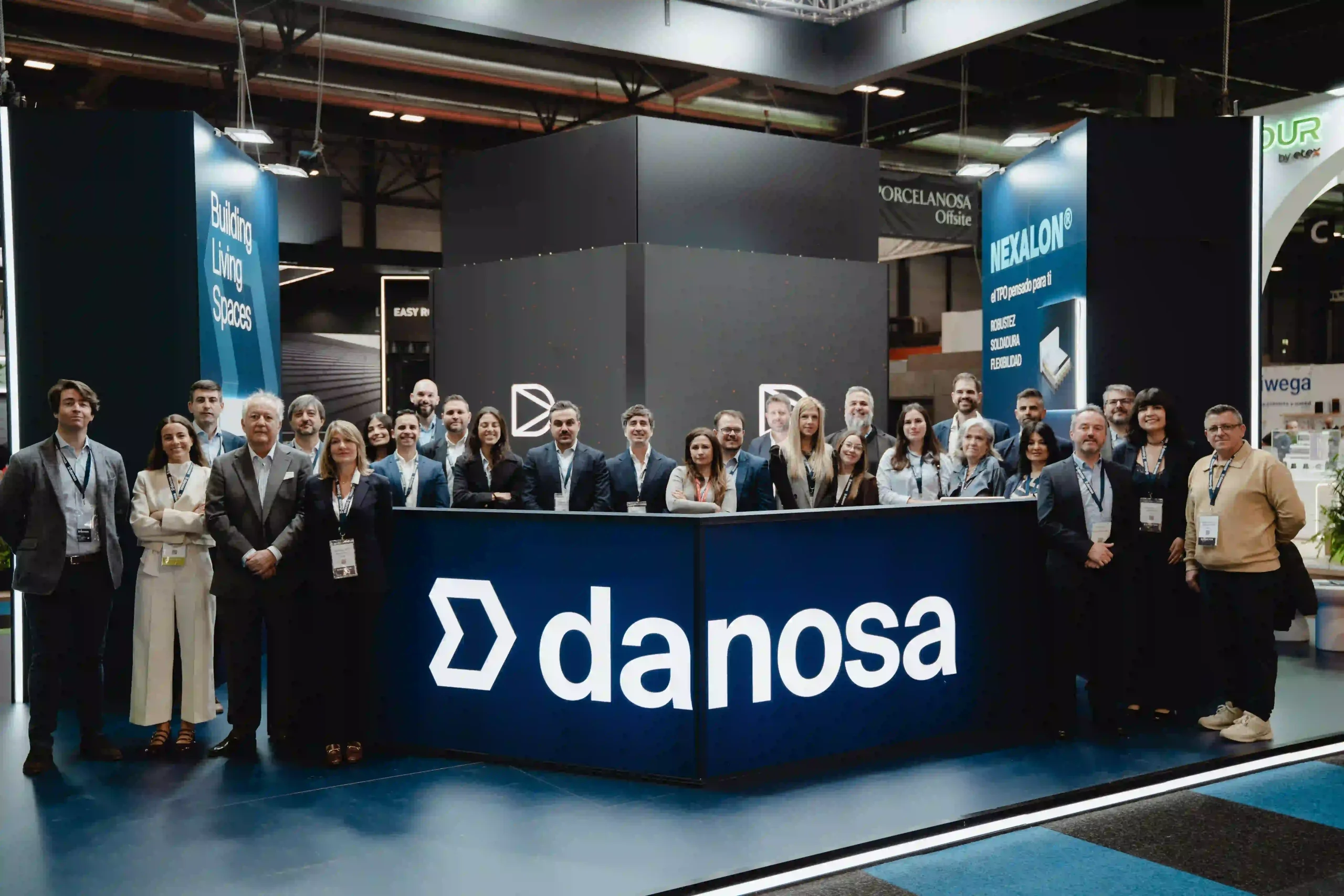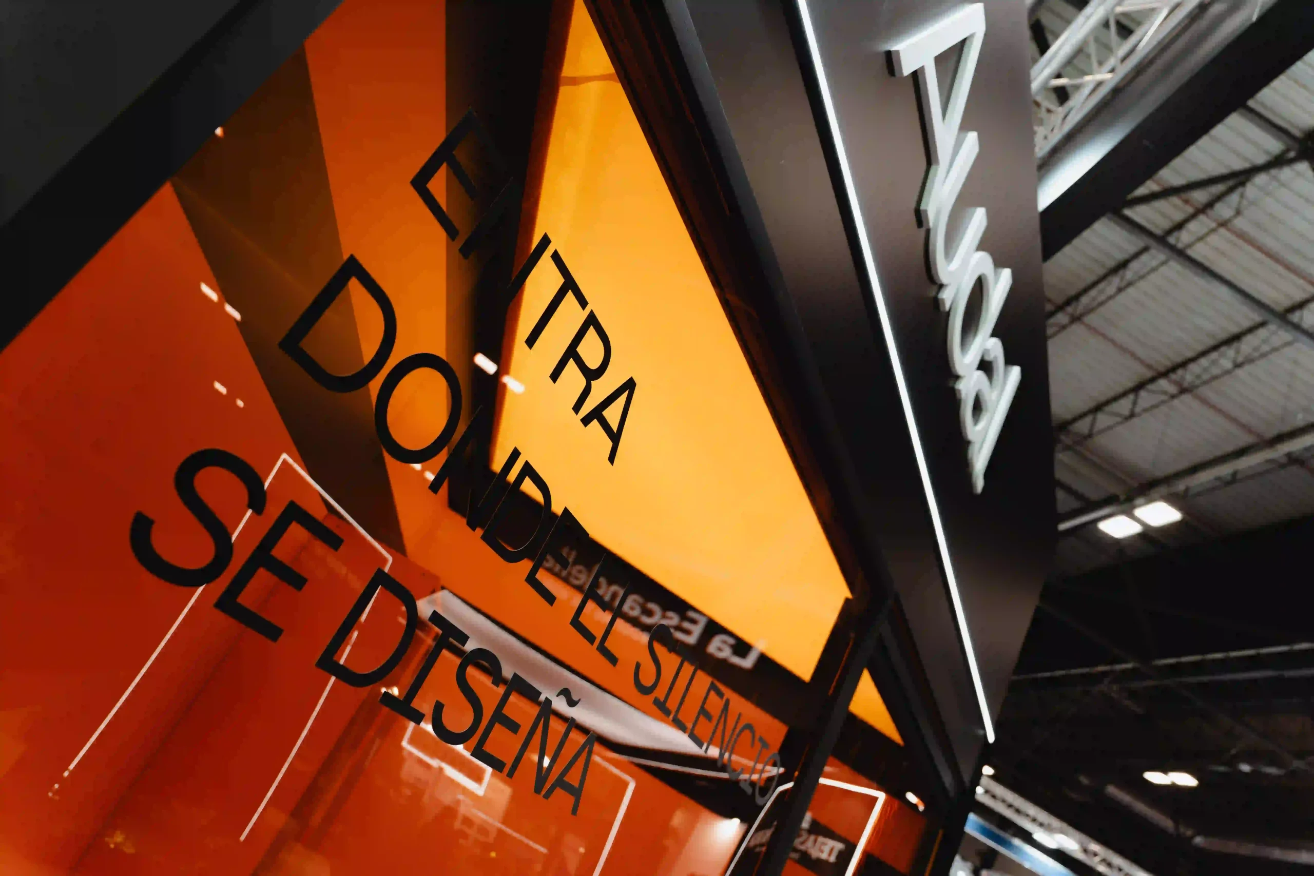 El diseño del stand ferial es una extensión de la identidad de Danosa: solidez e innovación en un mismo espacio. La estructura del stand es abierta, con un truss colgante que luce el logotipo de Danosa iluminado en grande, asegurando que se vea desde cualquier ángulo. La combinación de colores de tonos oscuros con la iluminación crea una atmósfera profesional pero acogedora.