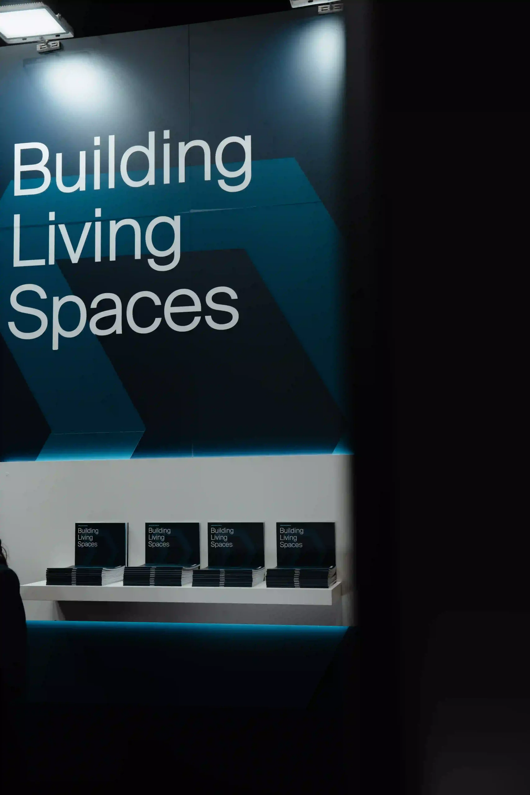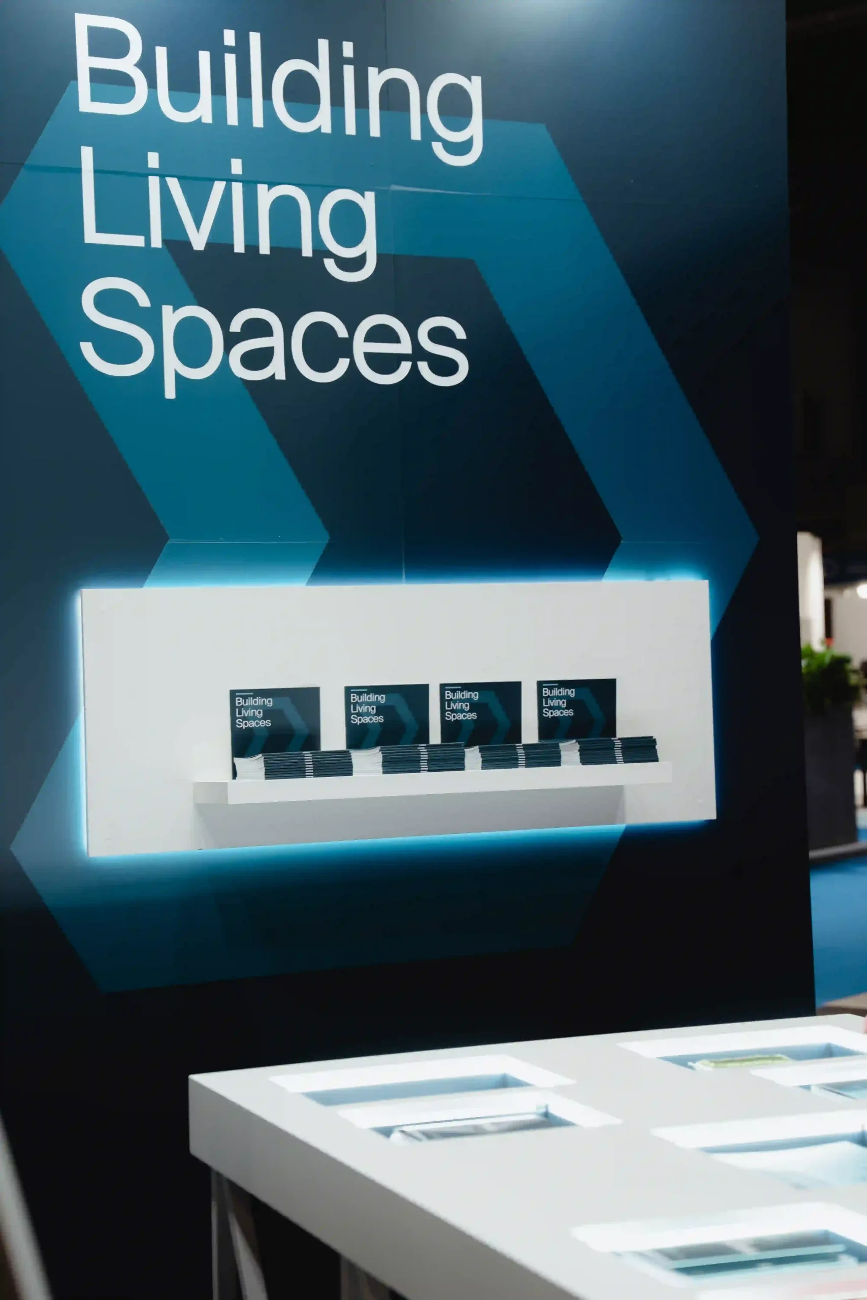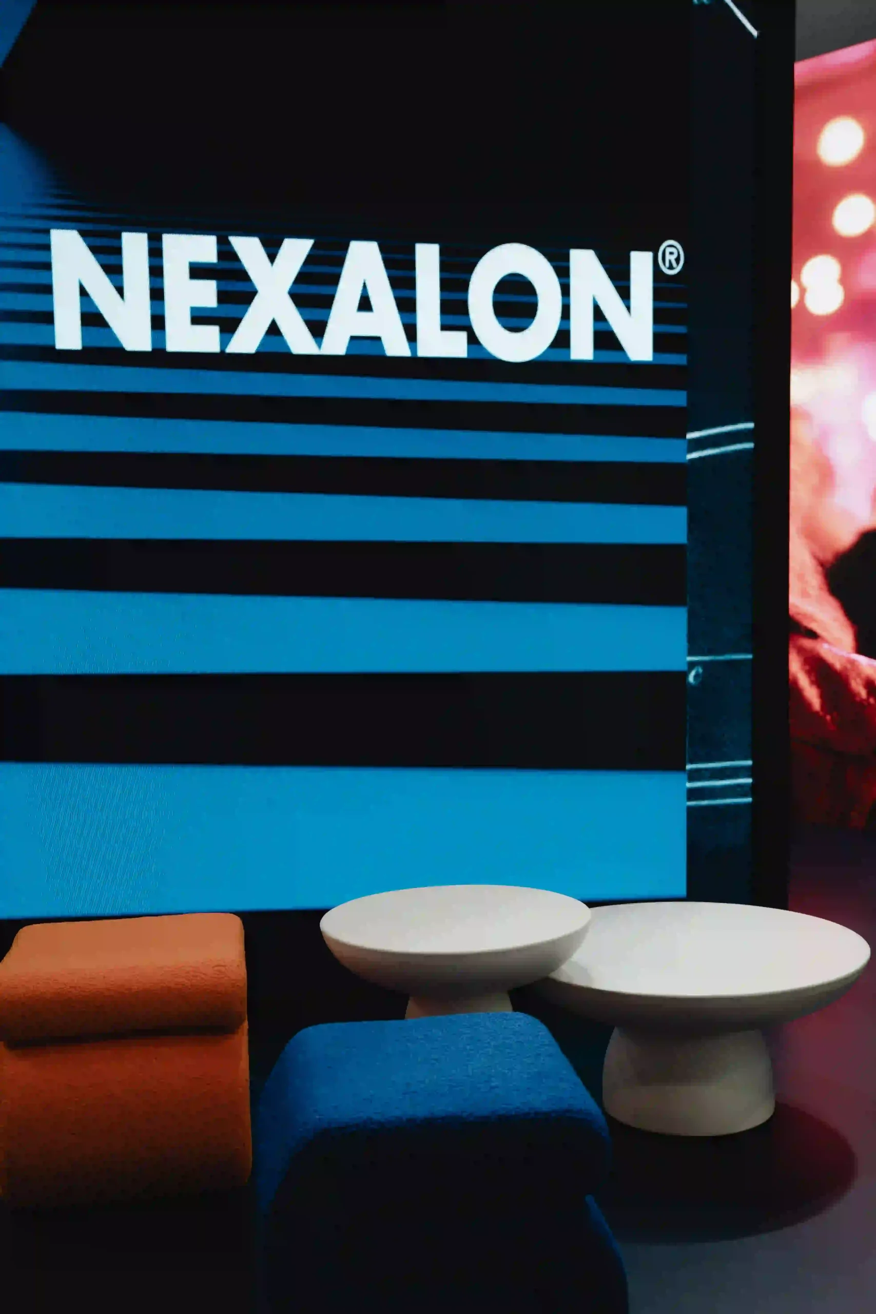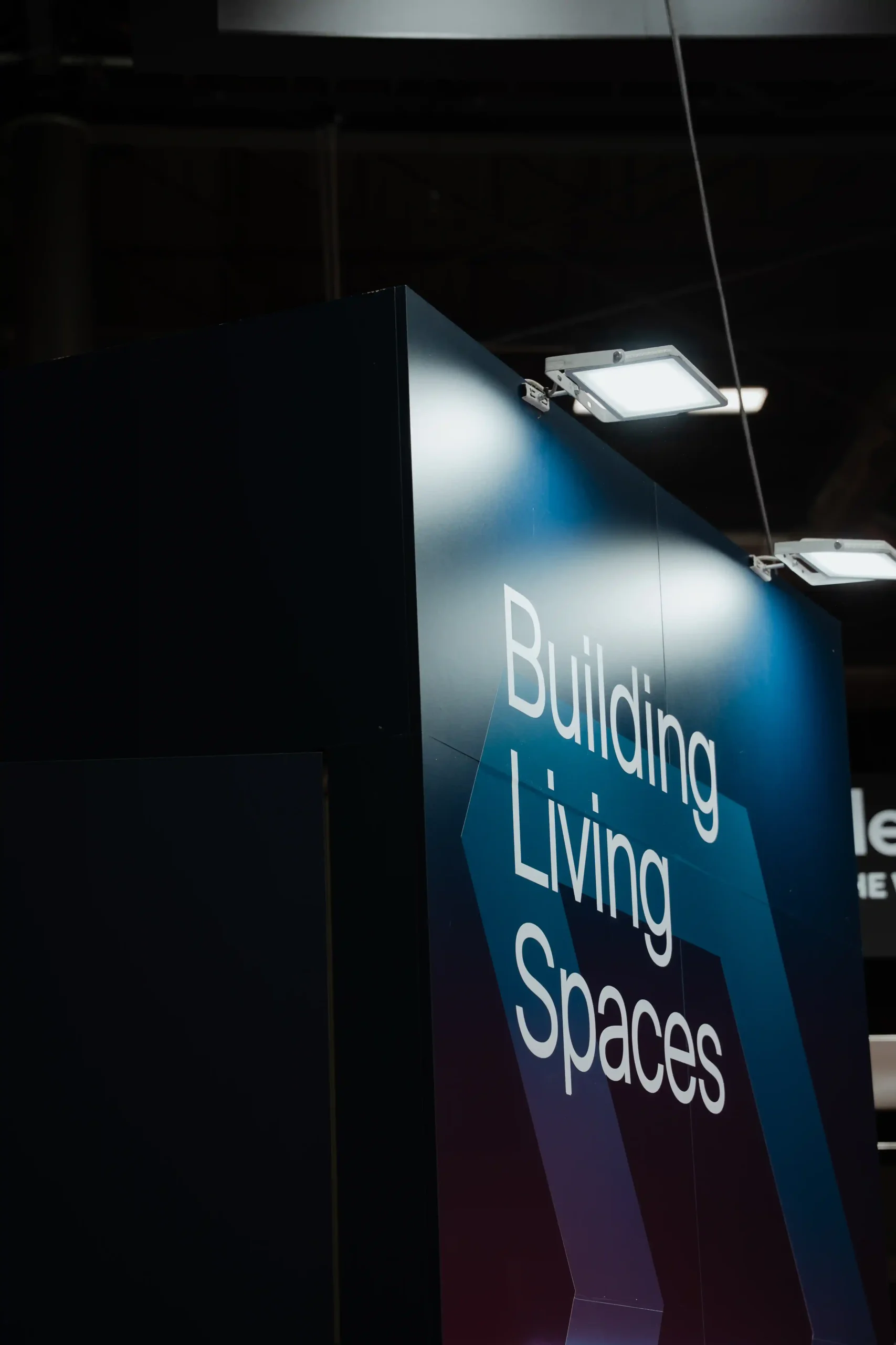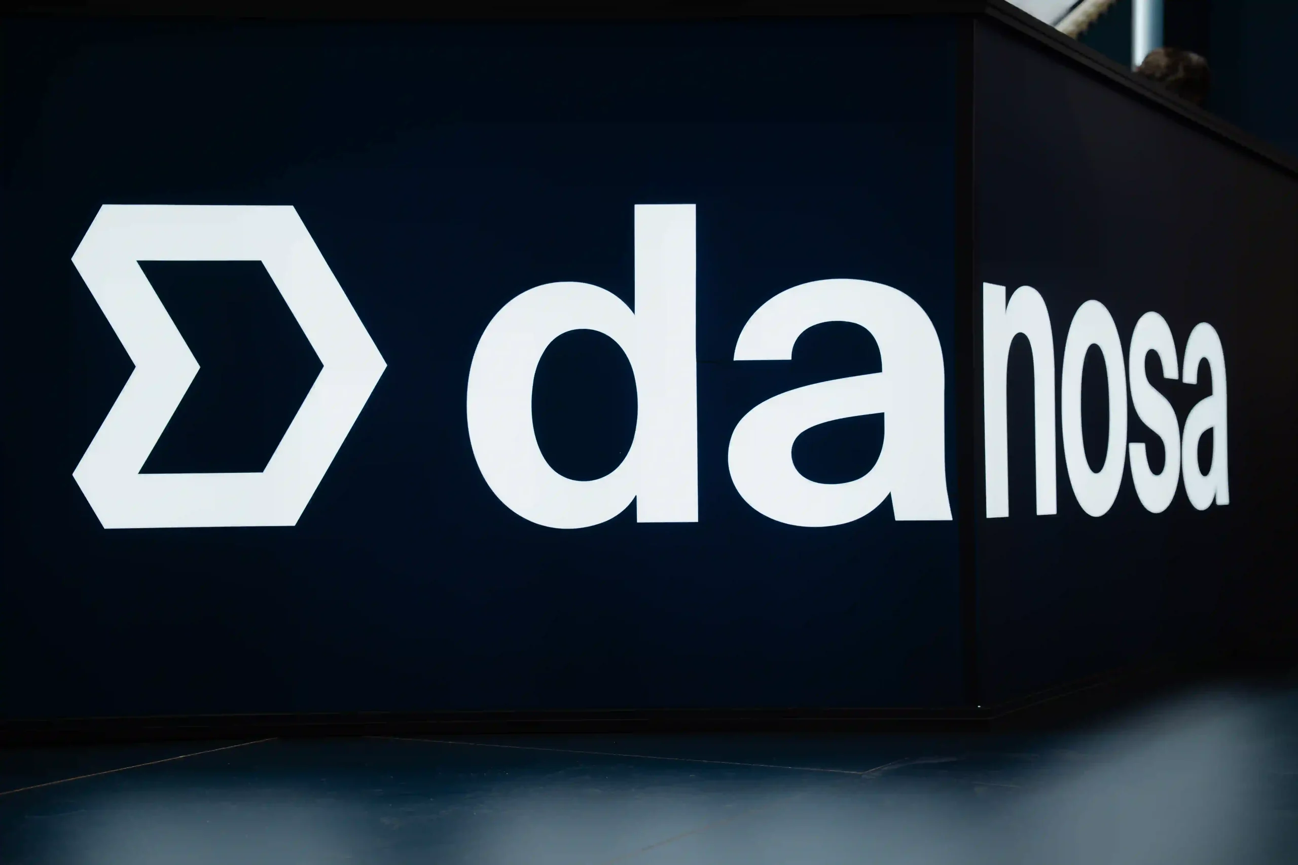 El diseño del stand ferial es una extensión de la identidad de Danosa: solidez e innovación en un mismo espacio. La estructura del stand es abierta, con un truss colgante que luce el logotipo de Danosa iluminado en grande, asegurando que se vea desde cualquier ángulo. La combinación de colores de tonos oscuros con la iluminación crea una atmósfera profesional pero acogedora.