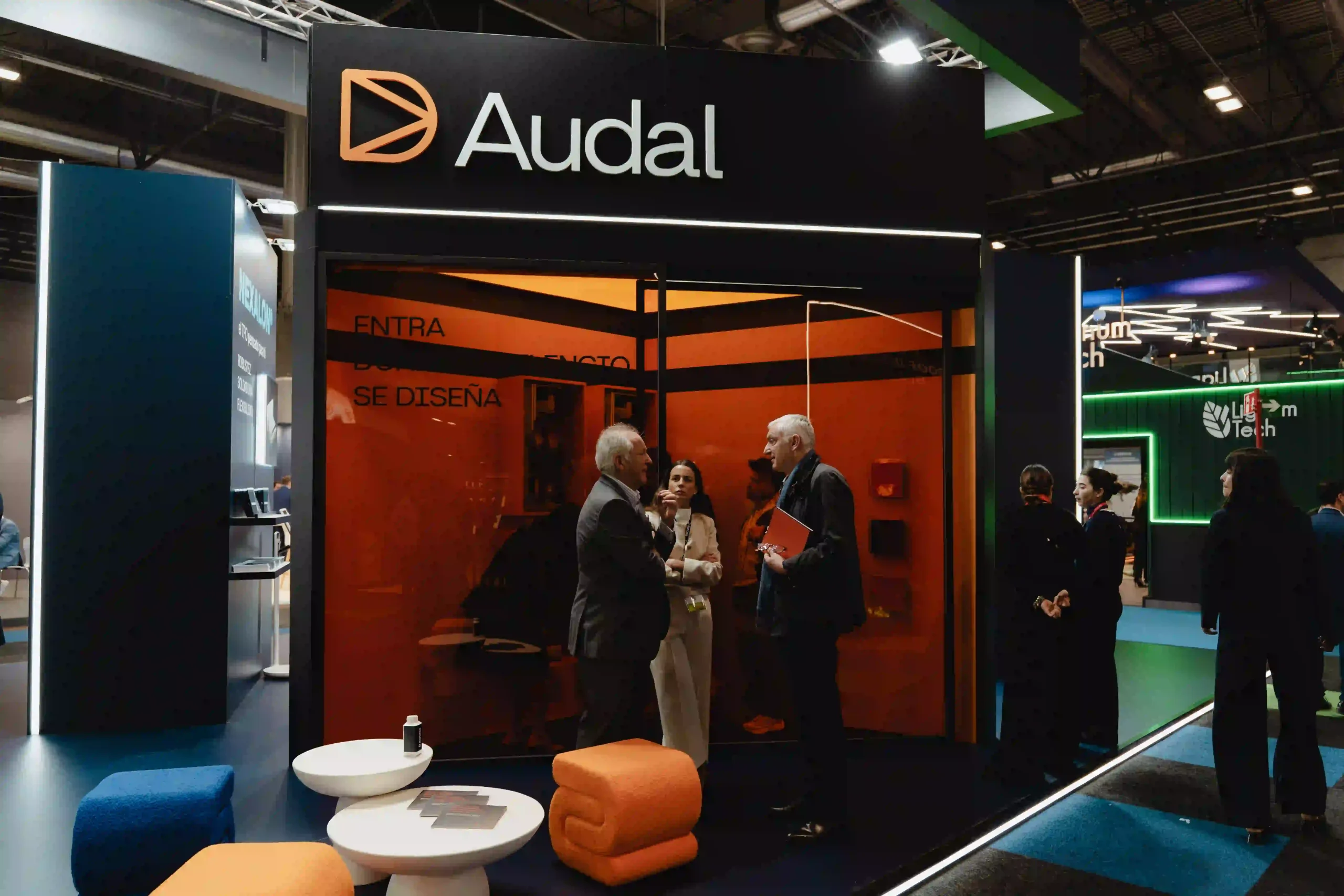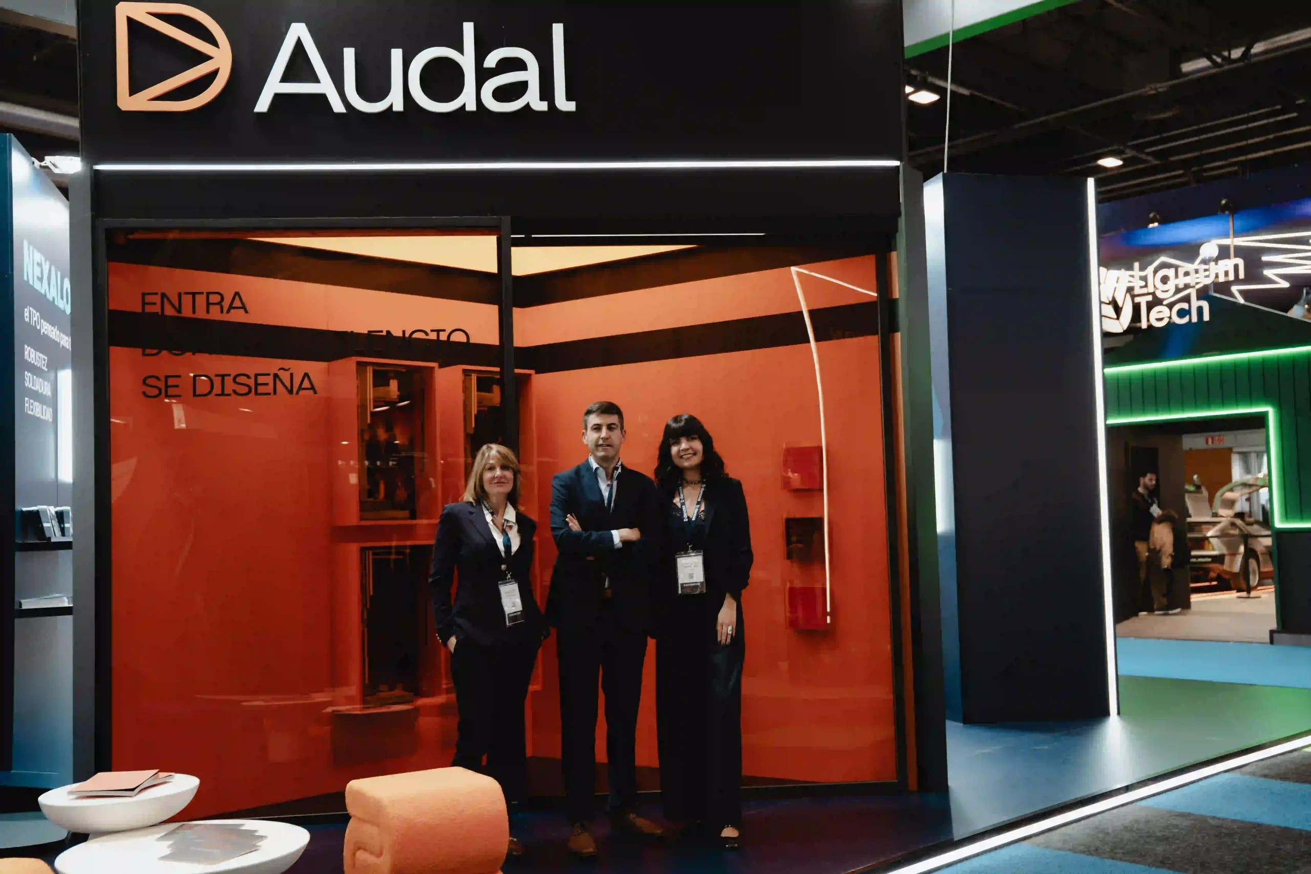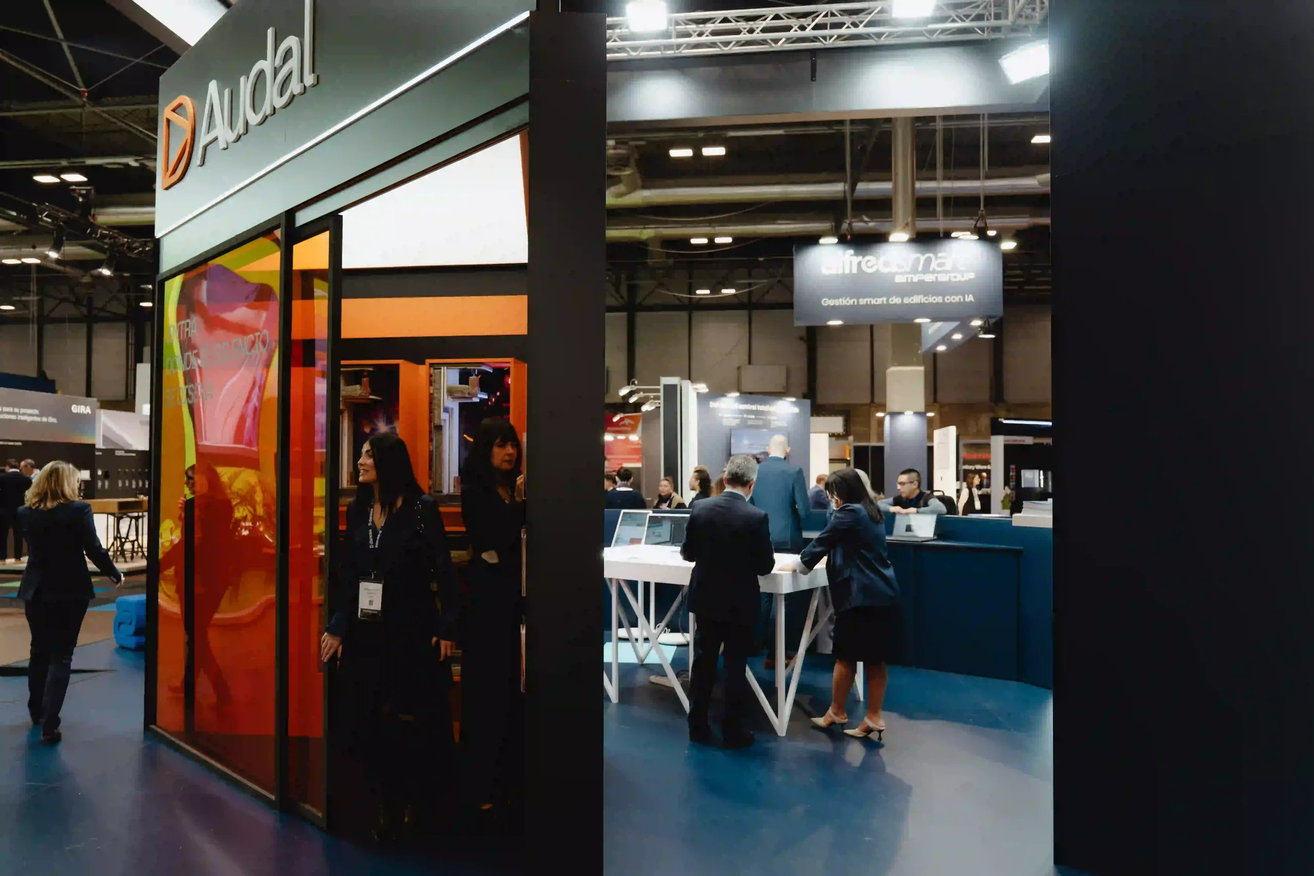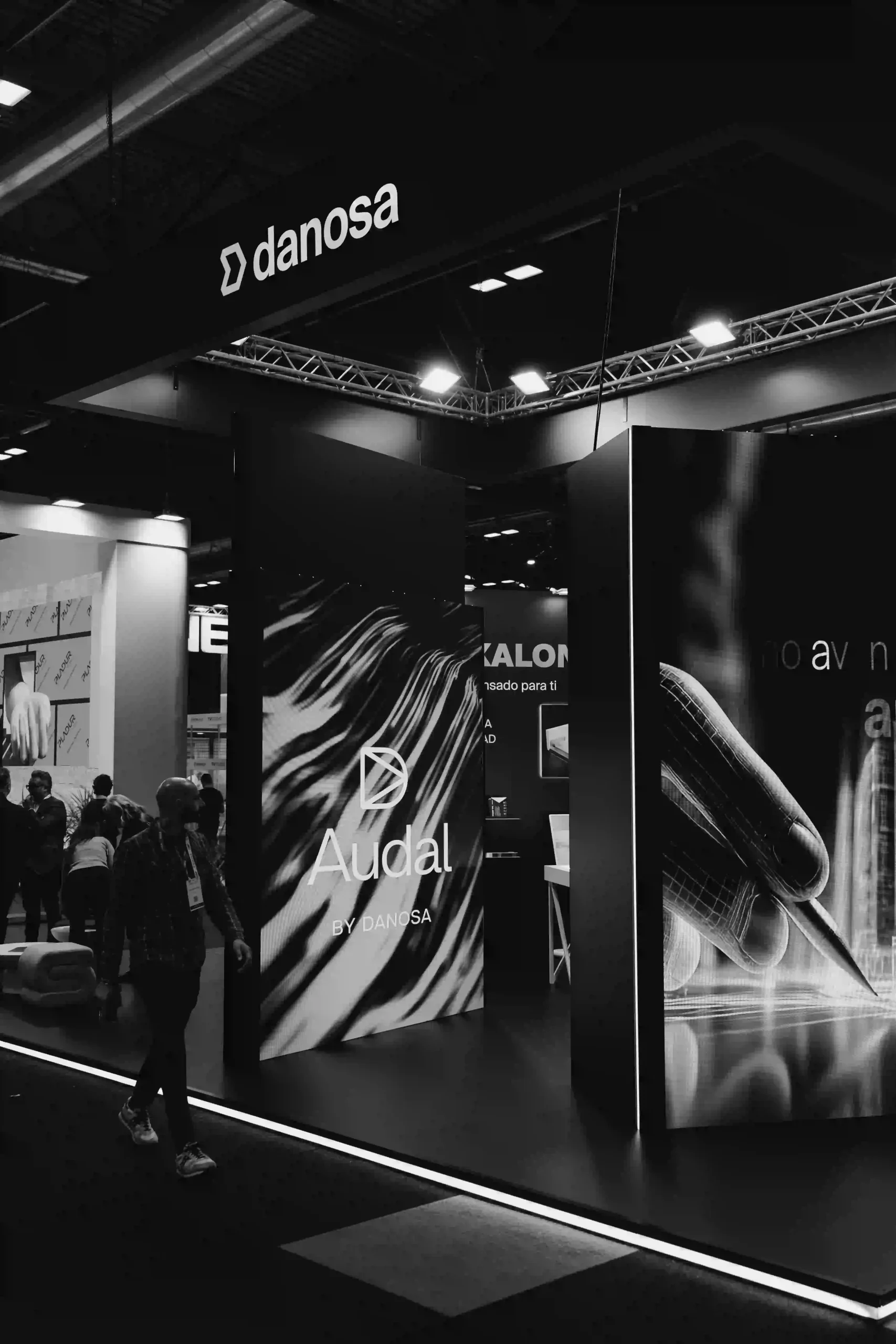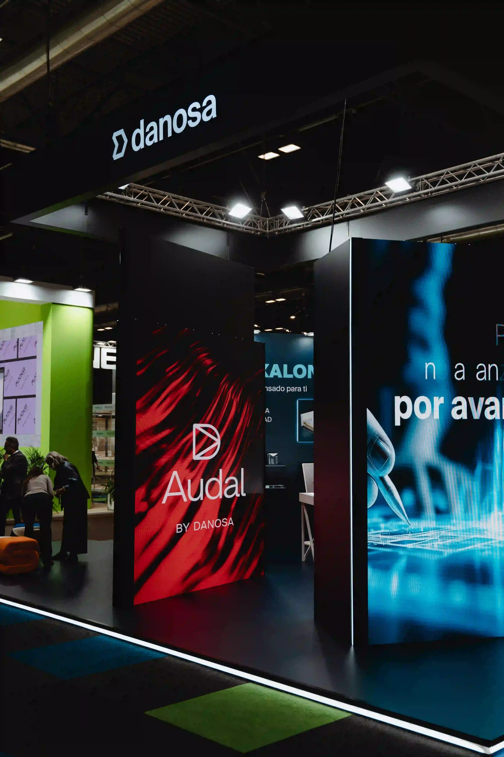 El uso de pantallas LED dinamiza el stand con visuales que complementan la estética de Audal y que combinan con los tonos oscuros de Danosa.