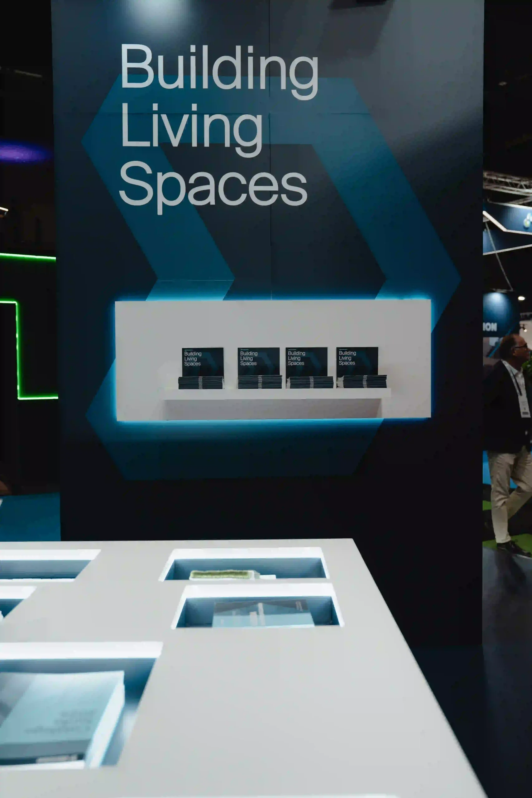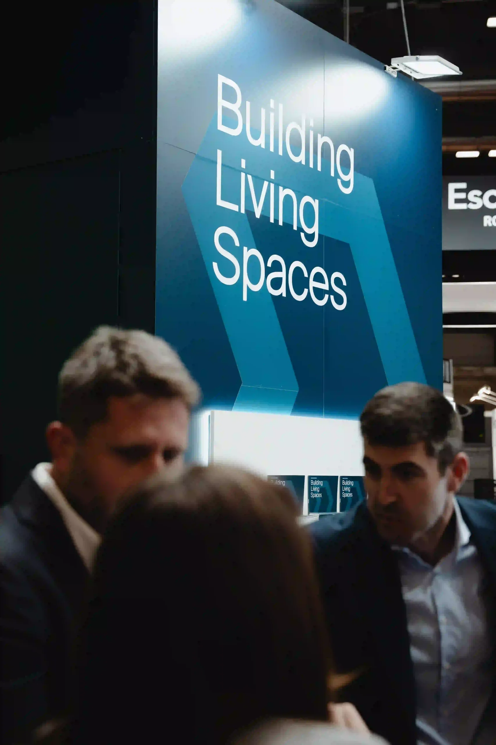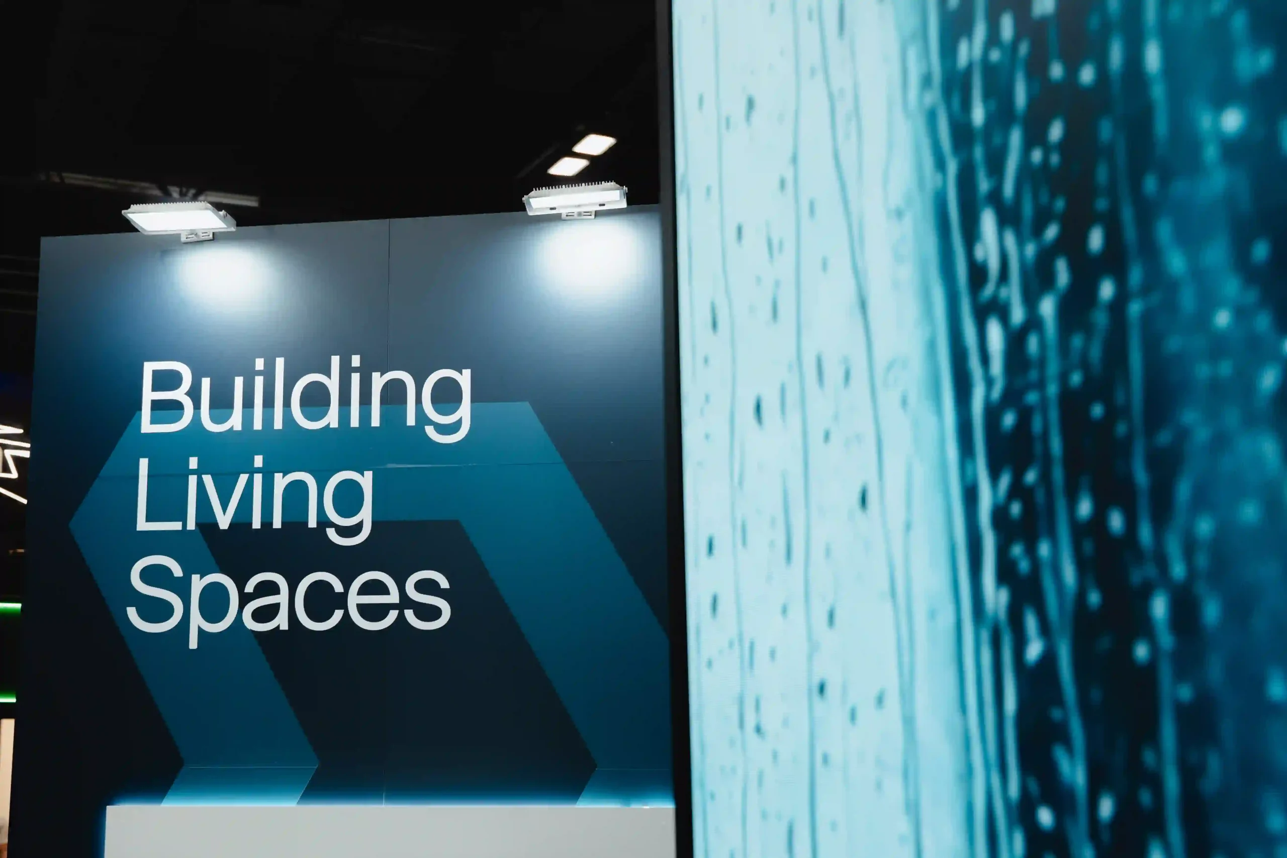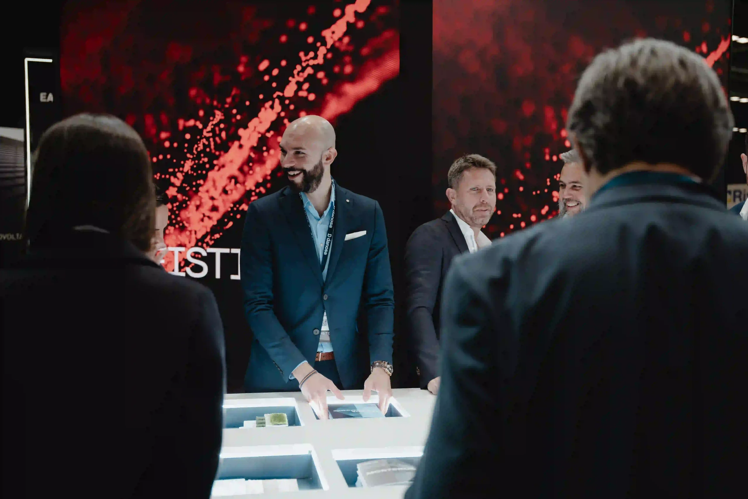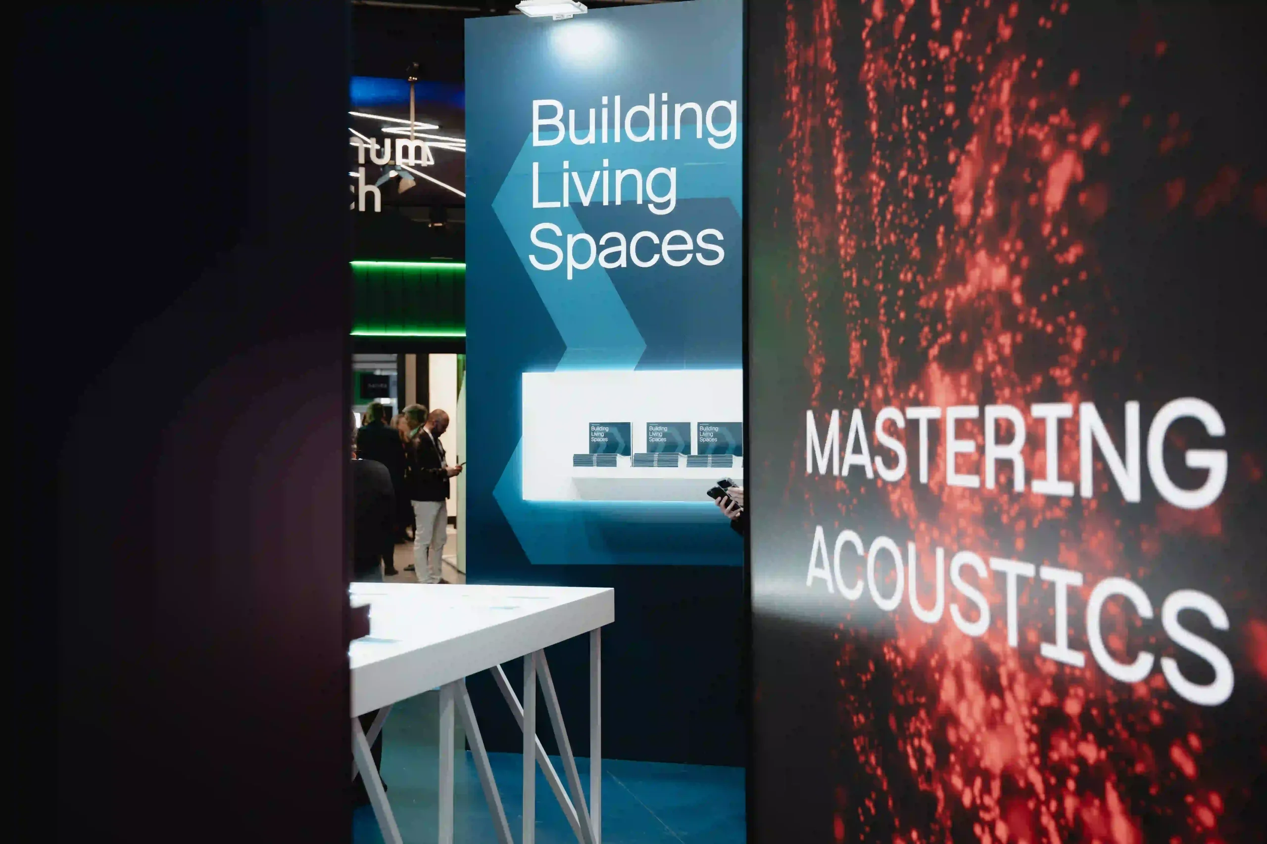 El uso de pantallas LED dinamiza el stand con visuales que complementan la estética de Audal y que combinan con los tonos oscuros de Danosa.