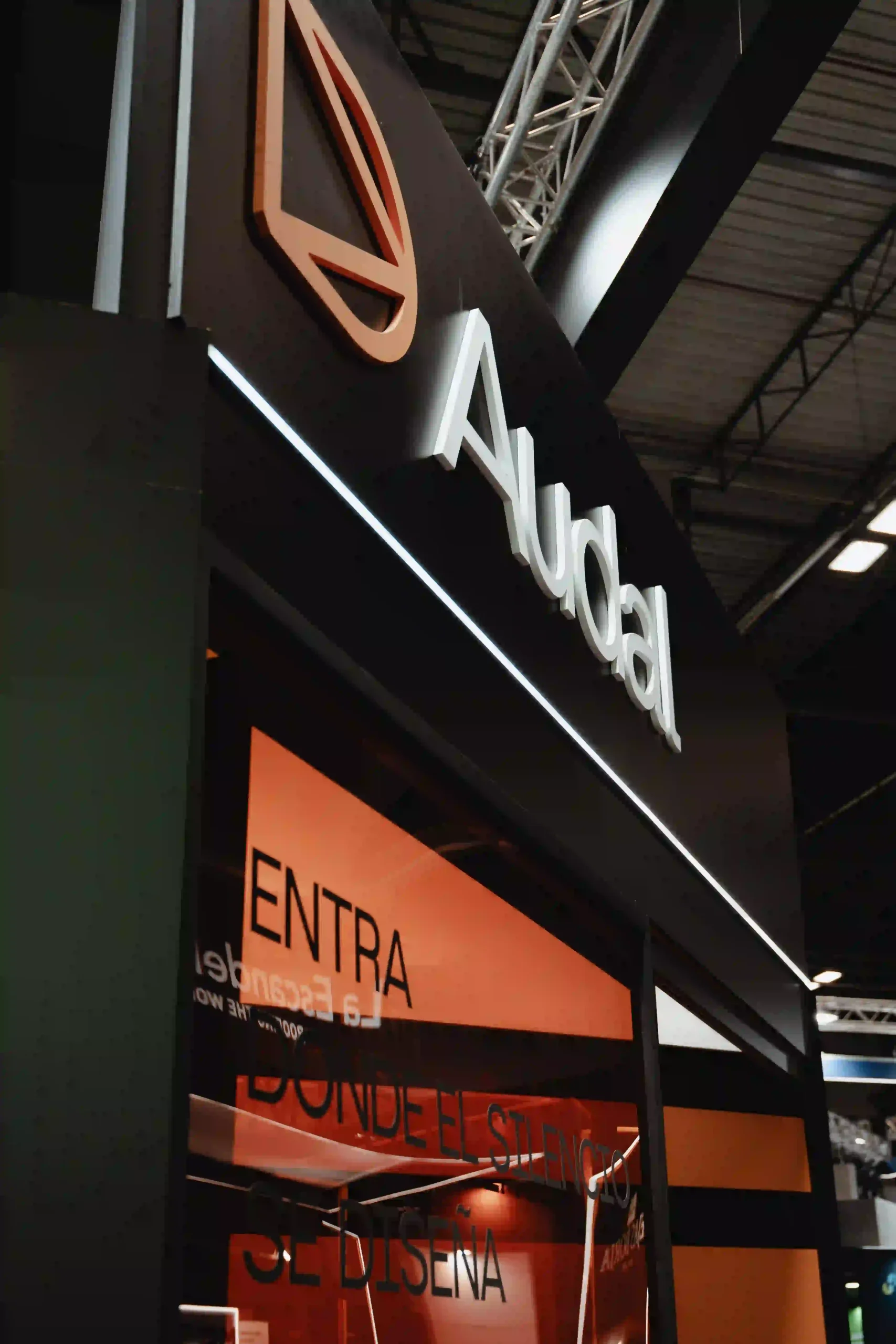 La zonificación estratégica permite establecer un recorrido para el vsitante, que guía hacia el corazón del stand donde se encuentra Audal, en un espacio envuelto en paredes de metacrilato tintada en naranja, que en el interior se halla una experiencia para la demostración del producto.