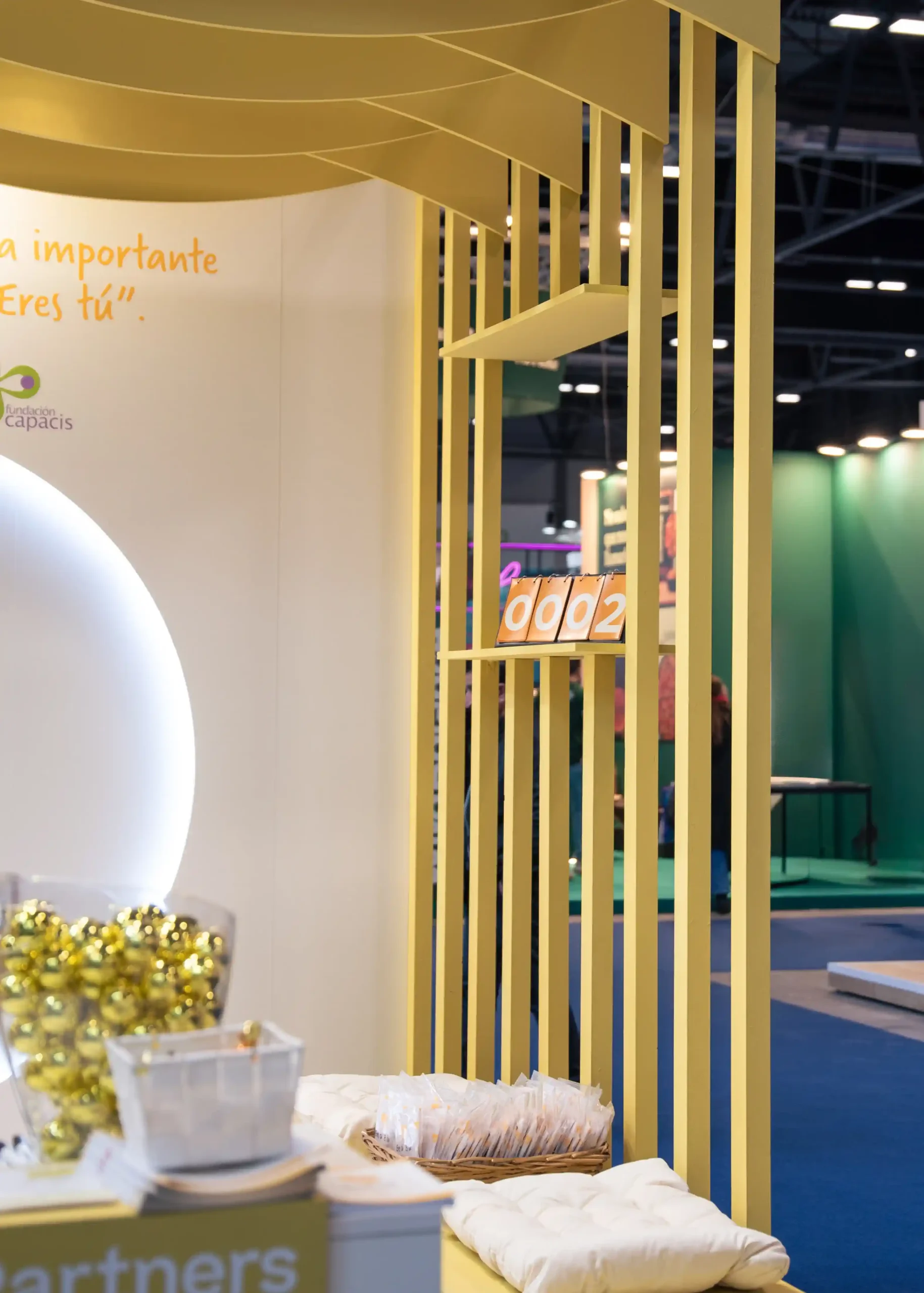 Los elementos corporativos son protagonistas. Mediante los logos identificables desde cualquier ángulo con el truss o los colores corporativos, la atención de los visitantes se capta en segundos. Una paleta de colores dominada por amarillo vibrante y blanco, generando energía y profesionalidad, que combinados con la madera, crean un espacio cómodo y acogedor.